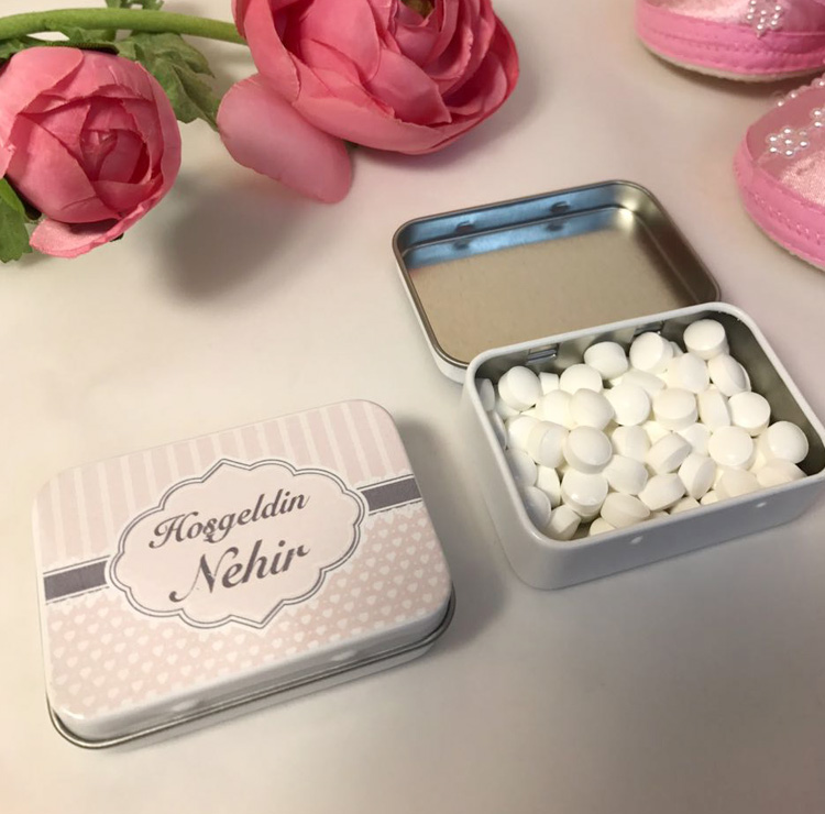 KİŞİYE ÖZEL NANELİ MİNT ŞEKER! Baby Shower, Mevlüt, Doğum Günü v.b. etkinliklerinizde dağıtabileceğiniz harika bir Naneli Mint Şeker.. Kutunun üzerine direkt baskı olup, İstediğiniz her türlü tasarımın baskısı yapılabilir. Kutu İçeriği : 60x 42x15 mm Ürün İçeriği : 30 gr Mint Şeker Teslimat Süresi : 3 gün Adet fiyatı olup, Bu üründen minimum 30 adet sipariş alınmaktadır.