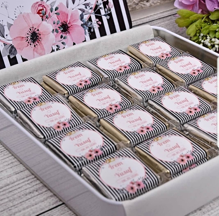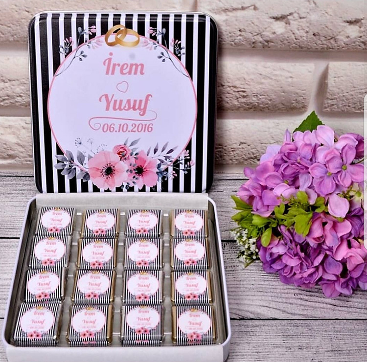 Metal Kutu üzerine sizin isminize özel baskı yapılmakta olup, 48 adet söz çikolatası kutuda standart olarak yer almaktadır.