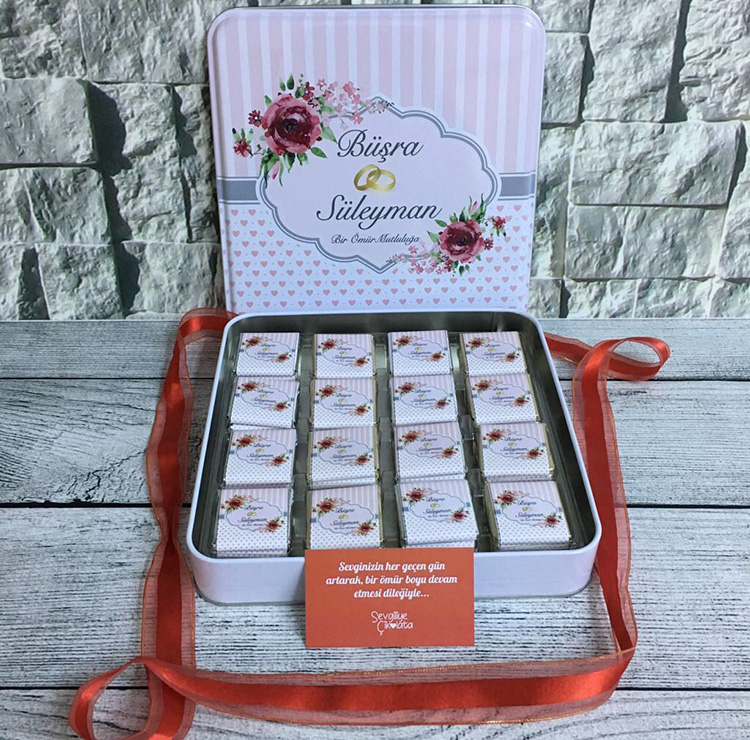 Metal Kutu üzerine sizin isminize özel baskı yapılmakta olup, 48 adet söz çikolatası kutuda standart olarak yer almaktadır.