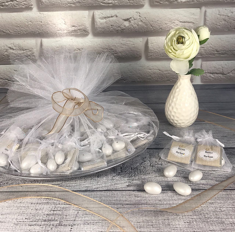 Tepsinin içinde 80 adet kese, her kesede özel tasarımlı söz-nişan çikolatası ve 2 adet sedef rengi draje bulunmaktadır.